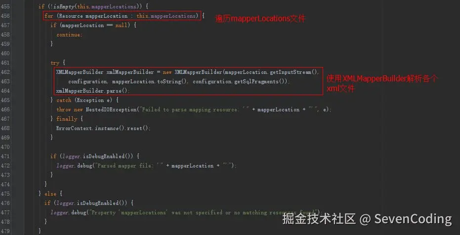 SqlSessionFactoryBean实现了Spring的InitializingBean接口,InitializingBean接口的afterPropertiesSet方法中会调用buildSqlSessionFactory方法 该方法内部会使用XMLConfigBuilder解析属性configLocation中配置的路径,还会使用XMLMapperBuilder属性解析mapperLocations属性中的各个xml文件。部分源码如下: