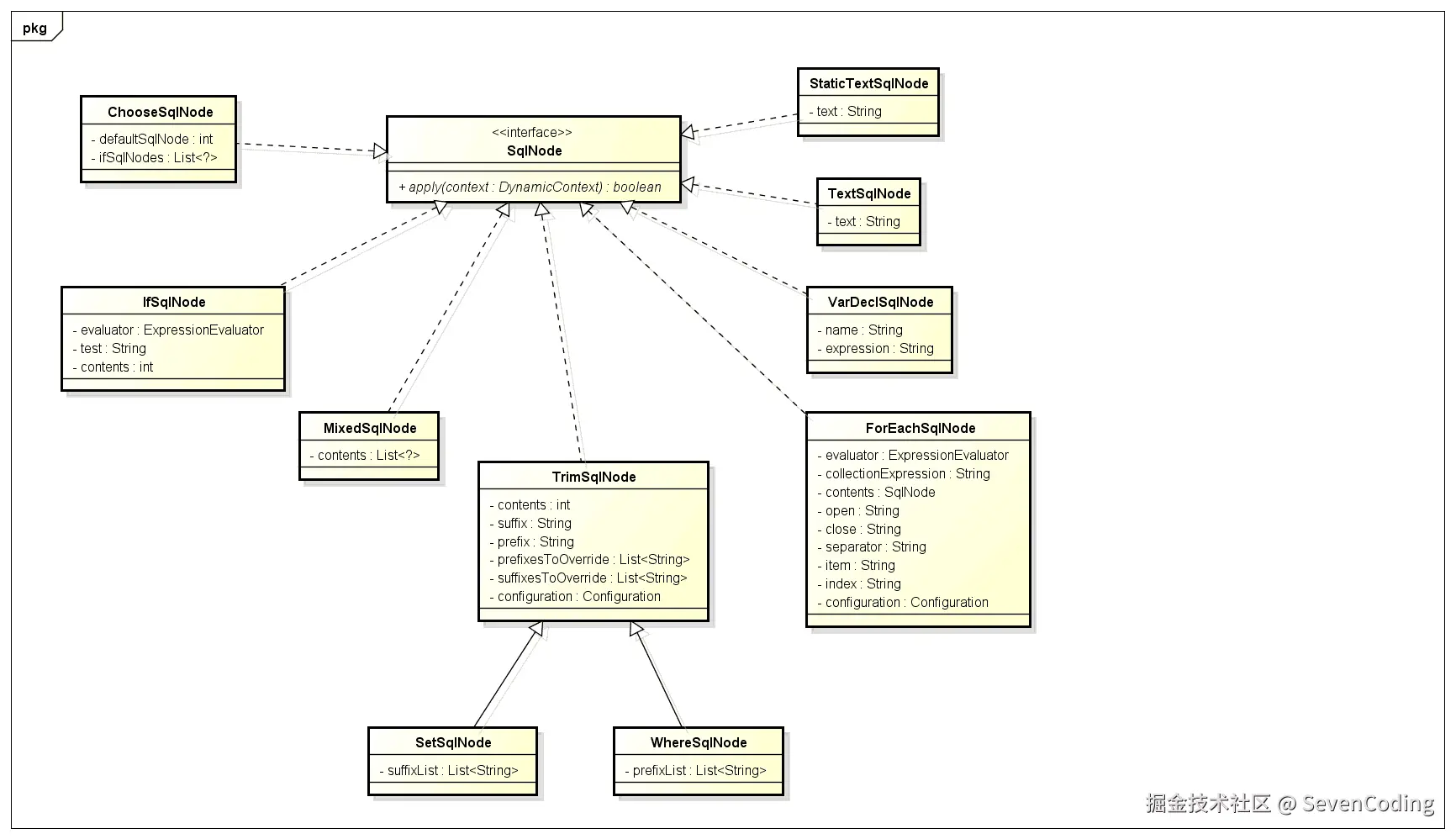 DynamicSqlSource内部的SqlNode属性是一个MixedSqlNode。然后我们看看各个SqlNode实现类的apply方法。下面分析一下各个SqlNode实现类的apply方法实现: