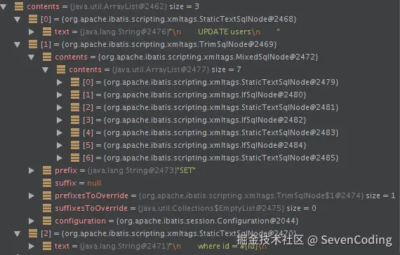 以上update方法最终通过parseDynamicTags方法得到的SqlNode集合如下: