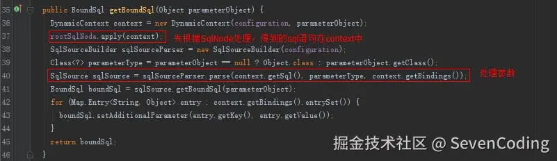TrimSqlNode的apply方法也是调用属性contents(一般都是MixedSqlNode)的apply方法,按照实例也就是7个SqlNode,都是StaticTextSqlNode和IfSqlNode。 最后会使用FilteredDynamicContext过滤掉prefix和suffix。
