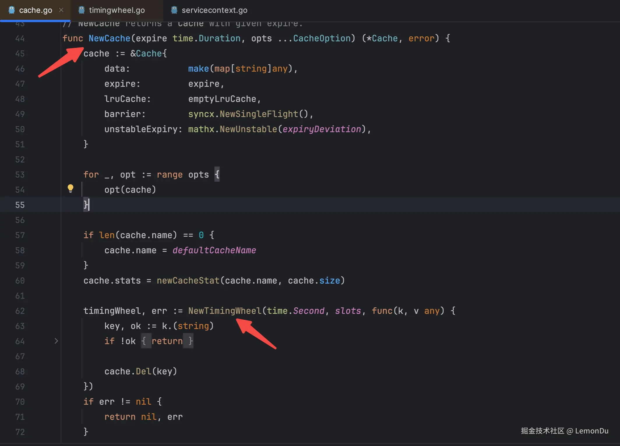 为了探究根本原因,我点进了collection包的源码进行查看,在其中NewCache()方法中找到了造成协程数异常增加的定时轮创建方法NewTimingWheel()。