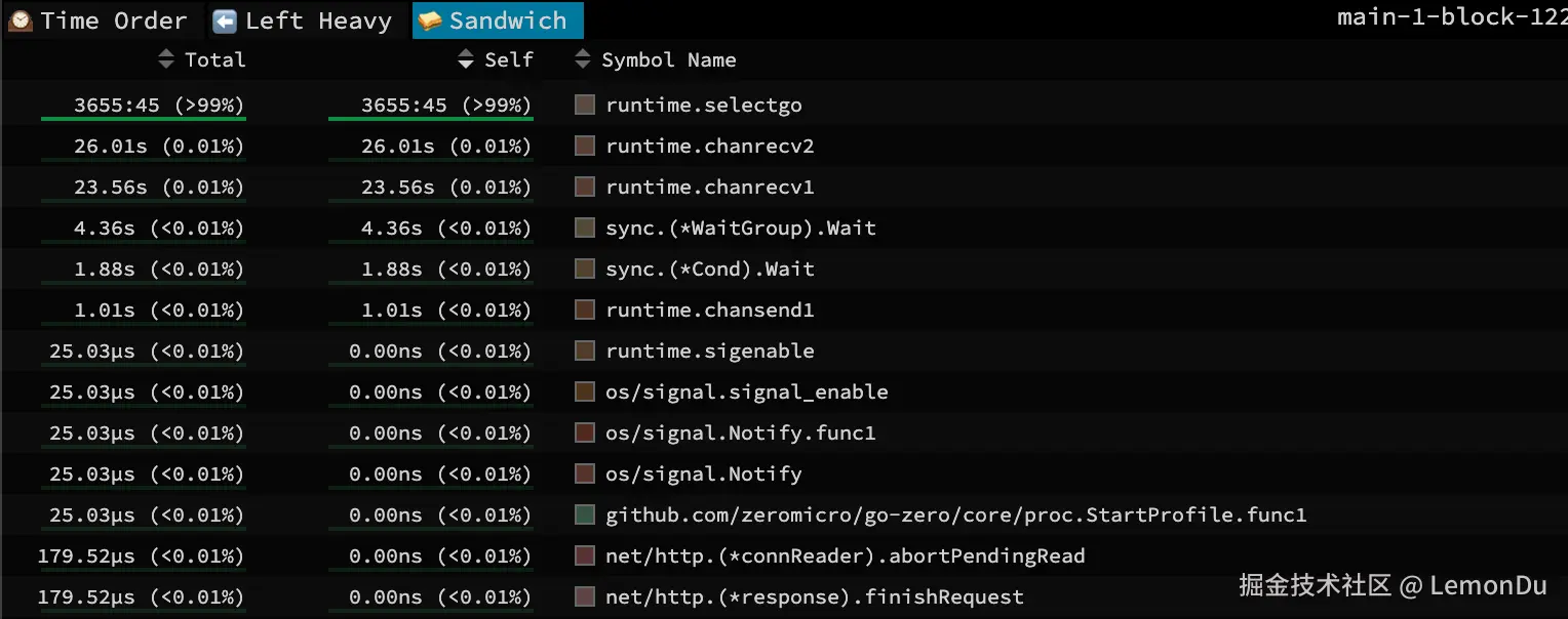 接下来查看阻塞操作的分析情况,从解析结果中可以看出,select的阻塞时间遥遥领先,select出现这种情况只会是存在case但是没有default的时候,当所有case不符合的时候,负责这个select的goroutine会阻塞住直到存在符合的case出现才会唤醒继续走下去,当时我看到这我满脑子问号,谁家好人select不加default啊?