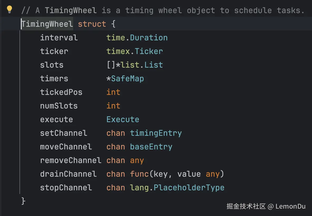 之后点进去这个方法进一步查看,可以看到这个定时轮的结构体,里面包含了四个channel以及一些其他数据结构,粗略估计这一个TimingWheel结构体所占内存要达到一百字节以上,这是一个比较庞大的对象,如果无限制的创建下去很容易造成内存OOM发生。