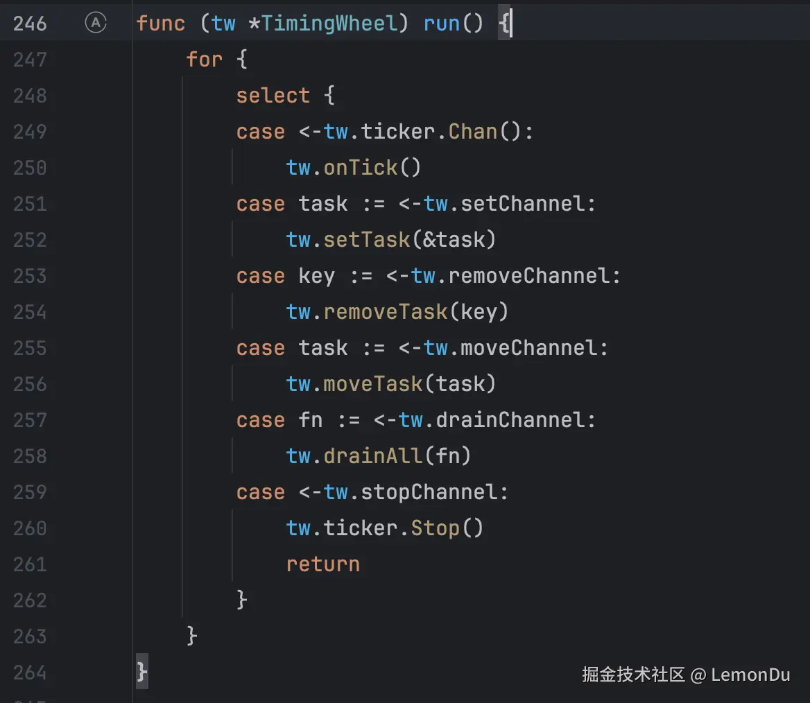 但是这个定时轮为什么会创建那么多呢?为什么不会关闭,按理说go-zero的源码不应该会有这么大的漏洞,继续查看这个定时轮的run()方法,终于发现了问题所在,这个定时轮中开启了select方法,并且没有default方法,所以之前阻塞文件那里才会显示select阻塞时间占比达到了99%,并且唯一关闭这个定时轮的方法是接收到tw.ticker.Stop()才会停止,那么这个stop方法会在什么时候调用呢?