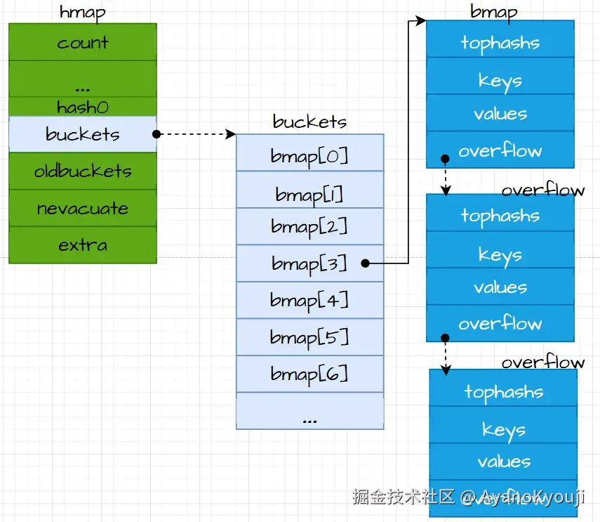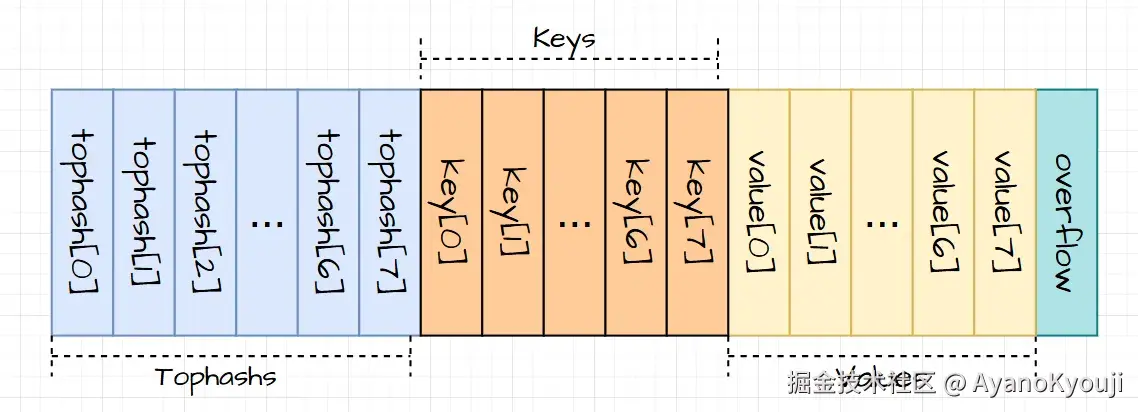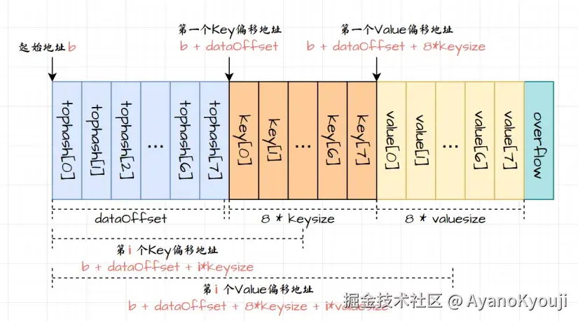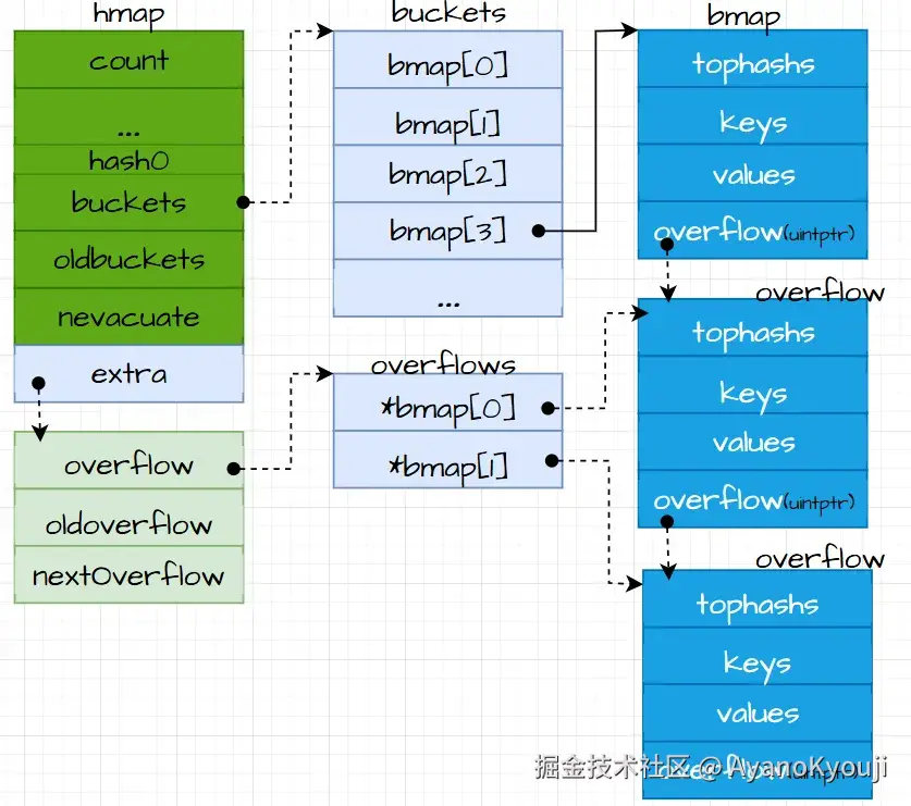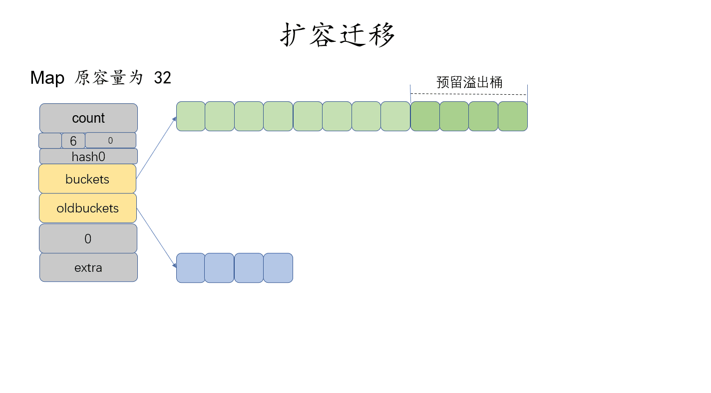 之后就是复制原槽位的 tophash、key、elem 到目标桶的目标槽位中了。当然还有我们在代码中省略了的一些其他流程,比如:拆分旧桶的溢出桶以及清除key/elem,和更新迁移进度等。若在意更加具体的迁移过程,则最好去阅读源码:evacuate。