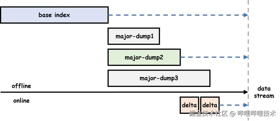 对于接入增量的索引服务,启动时除了加载天级基准索引,还需要回追kafka增量数据;一旦基准产出延迟或是增量qps大,则会导致索引服务启动时间大大拉长,给扩容带来潜在风险。为了加速服务启动,除了天级基准,离线还会定期基于增量数据构建major-dump索引。