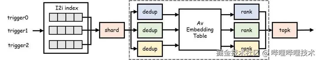 i2i索引检索之后,将候选按照 av_id % shard_num 分配到多个shard中,然后去重、查emb索引、打分多shard并发,以最大程度降低耗时。打分方面,支持fp32、fp16精度及int32、int16、int8的量化打分,也基于simd优化打分规模与性能。此外,我们也支持按trigger分配召回quota,保证召回结果的多样性。