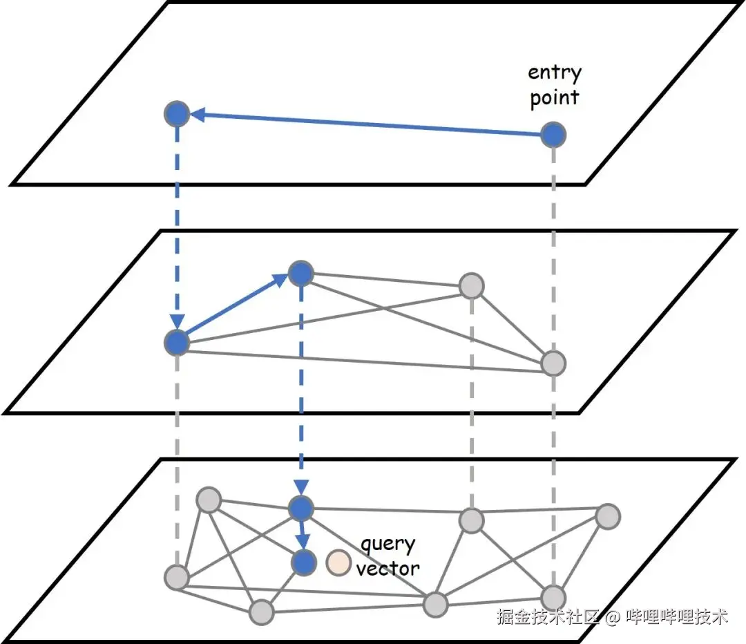- 当进行搜索时,从图的顶层开始,快速定位到可能包含相似向量的区域,然后逐渐深入到底层更精细的区域进行搜索,通过不断地在图中 “跳跃” 和探索邻居节点,找到与查询向量最相似的向量;