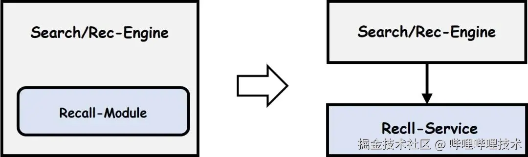 在搜推系统迭代历程之初,召回策略相对较为简单,召回仅仅被定位为搜推业务引擎服务内的一个子模块。伴随业务的持续拓展,单体巨型的引擎服务暴露出诸多问题,如代码复杂度过高、可维护性大幅下降、内存资源逼近瓶颈等均制约了系统的进一步迭代。将召回模块从引擎服务中拆分出来,构建为独立的服务,成为了当时解决燃眉之急的关键举措。