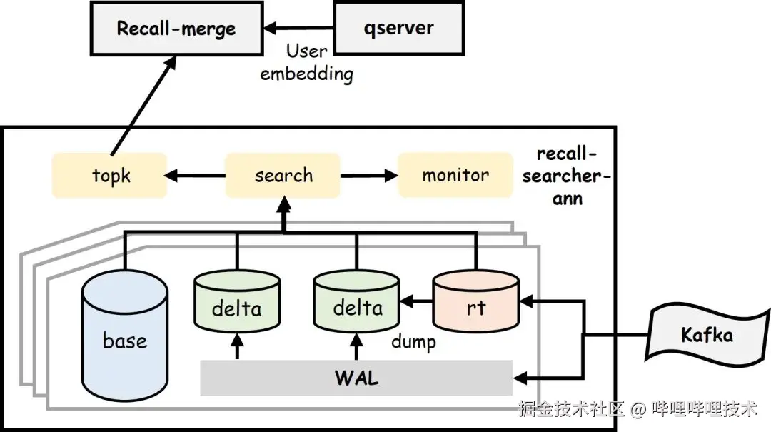 在线服务获取user-embedding后,并发查询base索引、多个delta索引、及一个rt索引,合并结果取最终的topk作为召回结果;