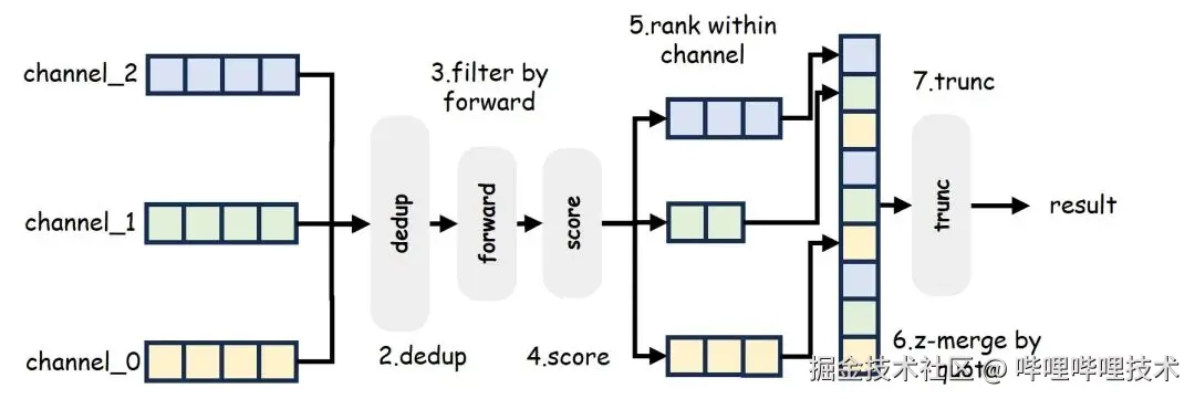 merge服务主要负责:多通道召回发起,多通道结果去重、过滤、打分&排序,最终合并多通道结果返回给引擎;