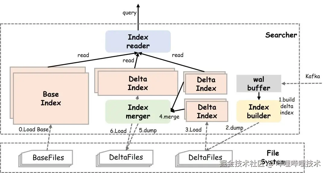 消费kafka实时增量后,会先写入wal-buffer中,积攒部分数据后,在线builder会构建一份delta索引;query查询时会合并base索引和多个delta索引的查询结果;delta索引的数量变多会导致读放大,定期通过index-merger将多个小的delta索引合并,保证索引查询的性能。