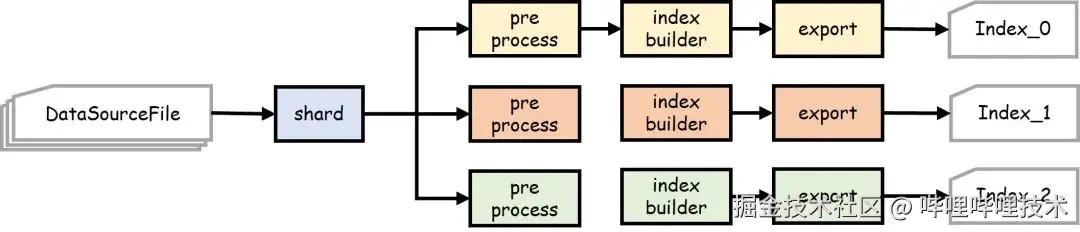 数据源产出后,会根据hash(key)%shard_num的方式均匀分到多个分片任务中进行处理。分片任务之间并行执行,首先进行预处理,然后由各种索引的builder将数据构建为便于加载的格式,并导出到文件系统;最后由数据平台配送到线上对应的索引服务上。