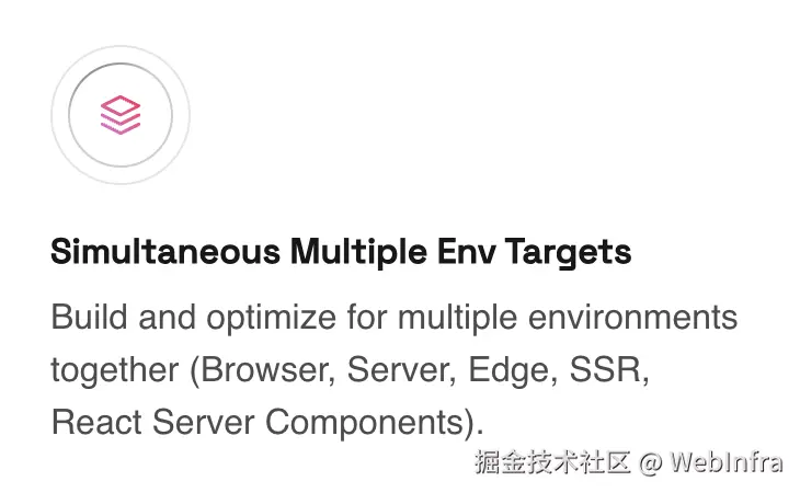 当然并不是所有的场景都适用于一次编译完成打包,对于 RSC 这种一部分模块运行在 server、一部分模块运行在 client,甚至 next.js 还有一部分 middleware 模块会运行在 server,是比较适合的;但对于 SSR 这种基本所有模块都既运行在 server 又运行在 client,就没太大必要了。
