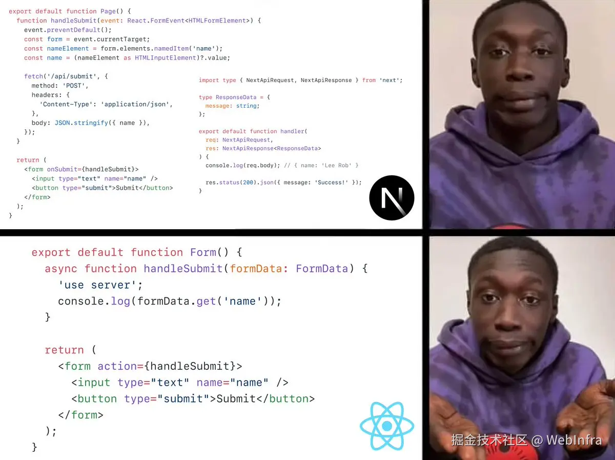 除了 Server Component 之外 React 也推出了 Server Action,目前还处于探索阶段,也没有 RFC,使用它可以很方便的调用服务端的接口,它强依赖了 Server,实现上部分和 Server Component 解耦,只使用 Client Component 时也能使用 Server Action。