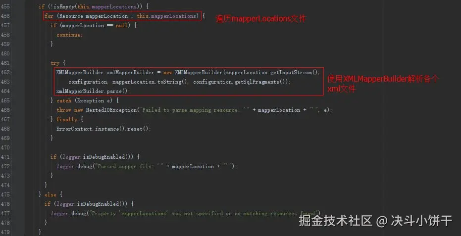 SqlSessionFactoryBean实现了Spring的InitializingBean接口,InitializingBean接口的afterPropertiesSet方法中会调用buildSqlSessionFactory方法 该方法内部会使用XMLConfigBuilder解析属性configLocation中配置的路径,还会使用XMLMapperBuilder属性解析mapperLocations属性中的各个xml文件。部分源码如下: