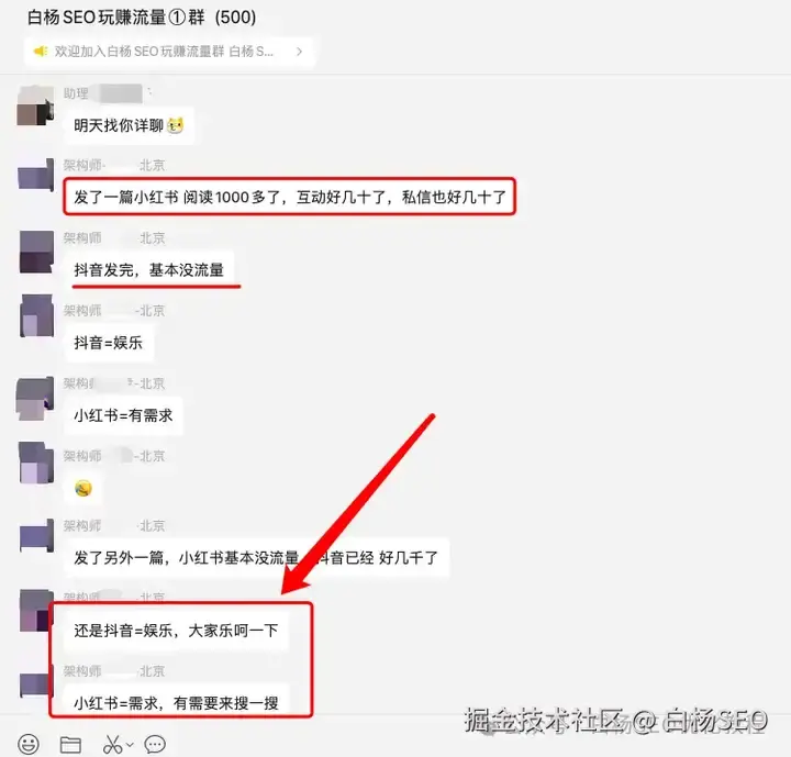 我把这篇总结的原创文章分享到我自己的几个付费社群,让大家注意和参与讨论,白杨SEO玩赚流量1群的一个群友用自己的实战案例来说:抖音=娱乐,小红书=需求,如截图。