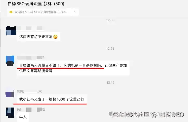 我们看之前聊天图中,还有人在问百度流量怎么又变化了之类,因为我的那个白杨SEO玩赚流量付费交流群是各平台,之前主要百度居多,所以还有人在做百度流量。
