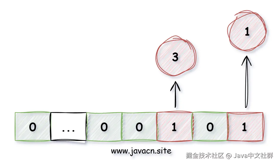 位数组是指使用位(bit)组成的数组,每个 QQ 号使用 1 位(bit)来存储,如下图所示:其中下标用来标识具体的数字,例如以上图片标识 1、3 数字存在,如果值为 0 表示不存在,这样的话 40 亿占用的位数组空间位 40 亿 bit,也就是 4000000000/1024/1024/1024/8=0.465 GB,不到 1G 的内存就可以存储 40 亿 QQ 号了,查询某个 QQ 号是否在线,只需要看这个 QQ 下标对应的位置是否为 1,1 表示存在,0 表示不存在。