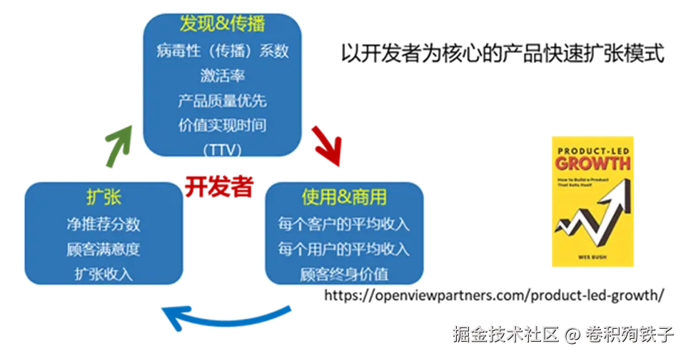 从经济模型上说,开源软件 = 低传播成本 + 传播承载体。 而这进一步发展出 Developer Focused-PLG 开发者为中心的PLG模式 ,在这个模型中,开发者成为商业模式跑通的核心纽带。