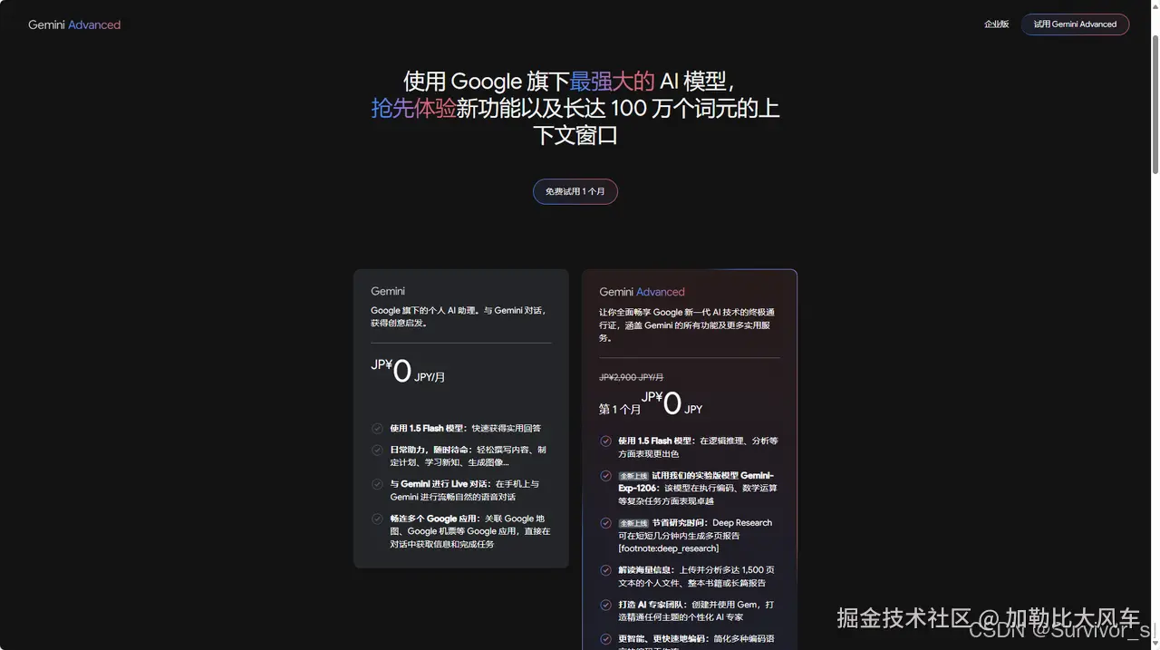 Gemini目前有为新用户提供一次免费试用机会(更早之前貌似是两个月,所以有的薅可以赶紧薅,不知道什么时候就又没得了😂),前1个月不收取任何费用,只要完成绑卡和支付,就能零成本感受高级模型的优势。