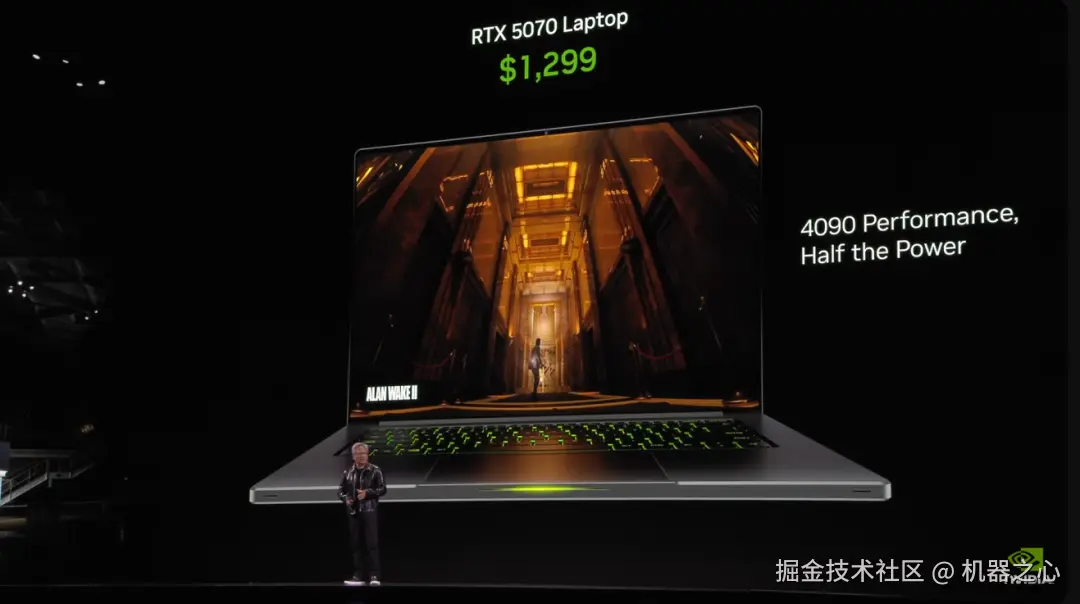 在移动端,RTX50 系列的性能提升也是非常可观的,黄仁勋特意拿出来一台 RTX 5070 的笔记本。今年移动版显卡的上市速度也会很快。