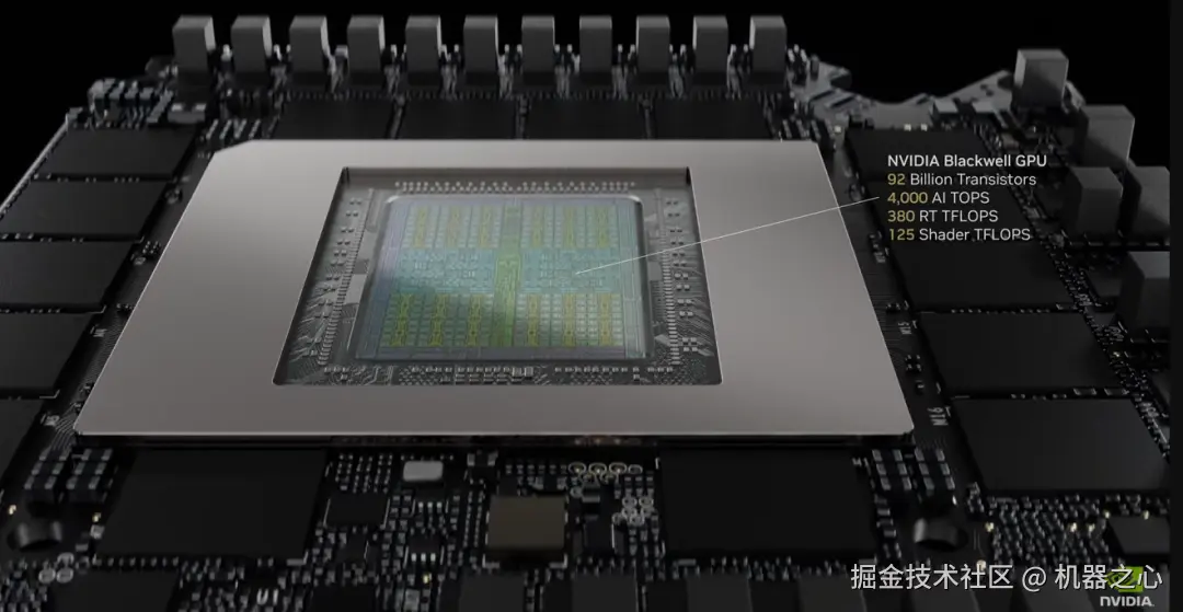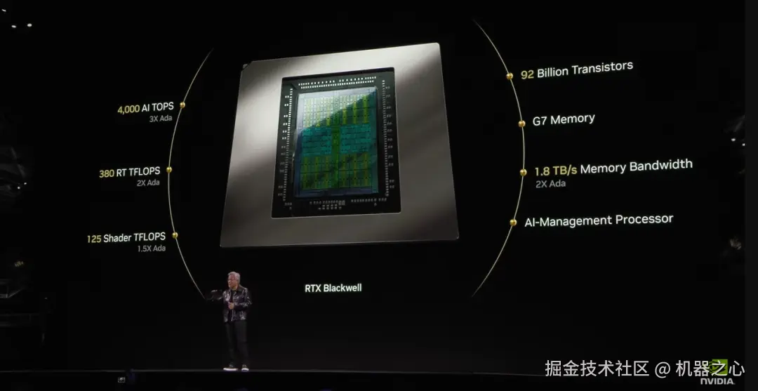 性能参数上,Blackwell GPU 的 RTX 5090 拥有 920 亿晶体管、3352 AI TOPS(每秒执行万亿次运算次数)、380 RT TFLOPS(每秒执行万亿次浮点运算次数)以及 125 Shader TFLOPS(着色单元)。