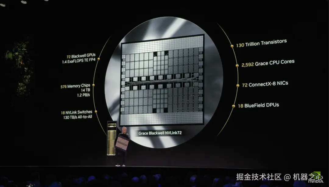 他手里拿着的一大块晶圆上面有 72 个 Blackwell GPU,AI 浮点性能达到 1.4 ExaFLOPS,这就是 Grace Blackwell NVLink72。