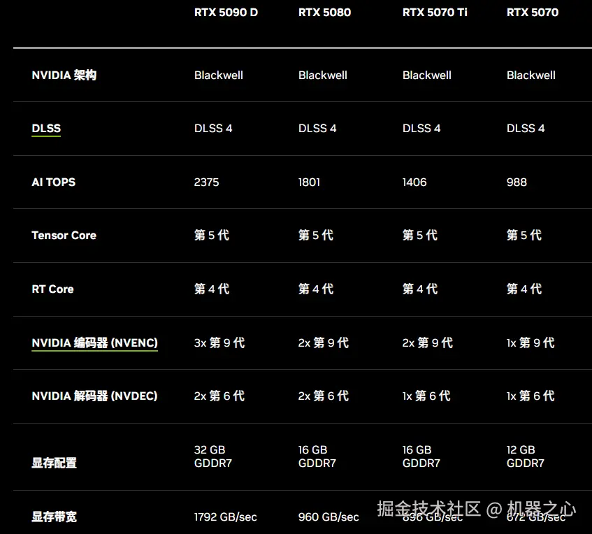 RTX5090(及 5090D)拥有 32 GB GDDR7 显存,显存位宽 512 位,CUDA 核心数量是 21760,功耗 575W。更详细的指标如下图所示: