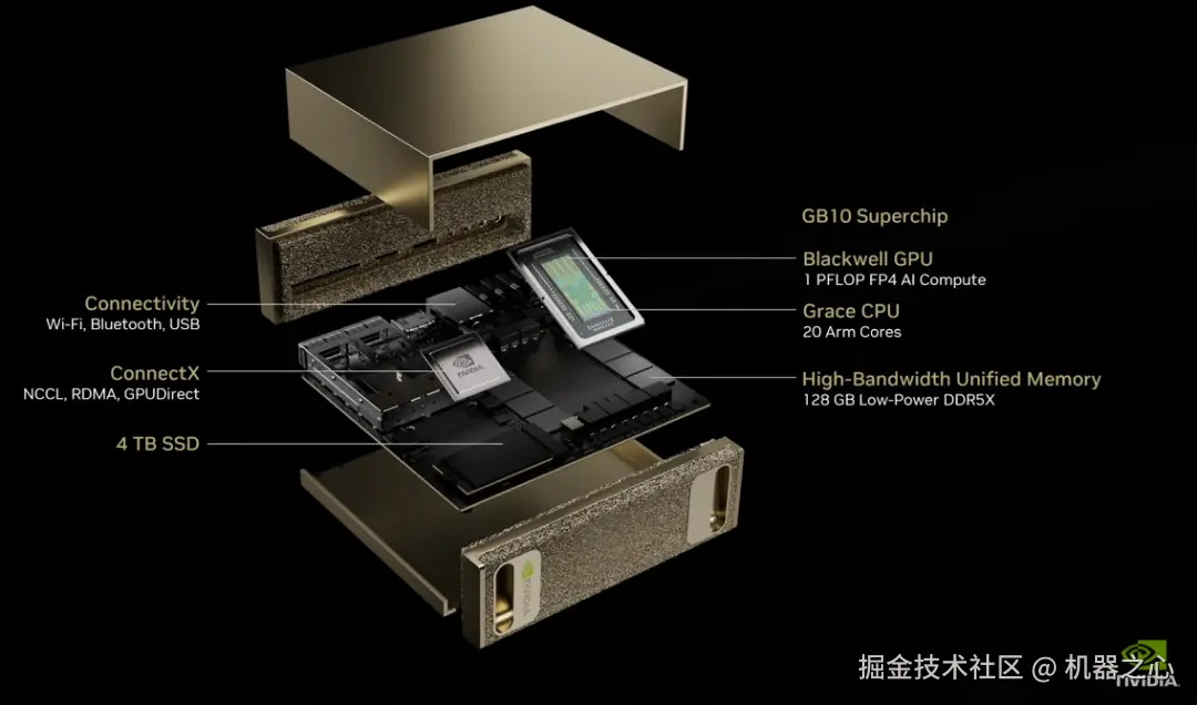 GB10 超级芯片(Superchip)是基于 Grace Blackwell 架构的 SoC,可在 FP4 精度下提供高达 1 PFLOPS 的 AI 性能。