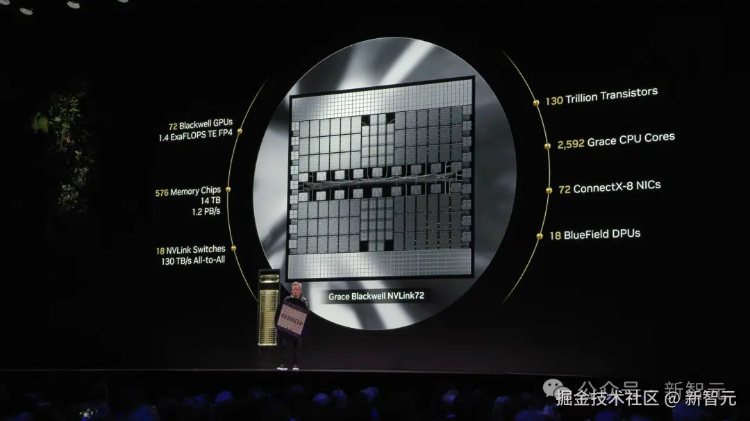它配备了 72 个 Blackwell GPU、1.4 exaFLOPS 算力和 130 万亿个晶体管,目标是超越世界最快超算。