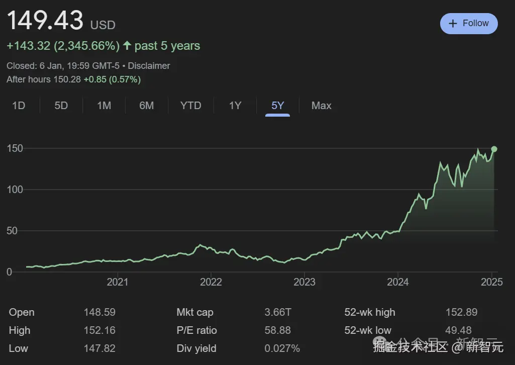 一夜间,英伟达股价大涨超 3%,以每股超 150 美元的价格收盘,超过 11 月创下的每股 148.88 历史最高收盘纪录。