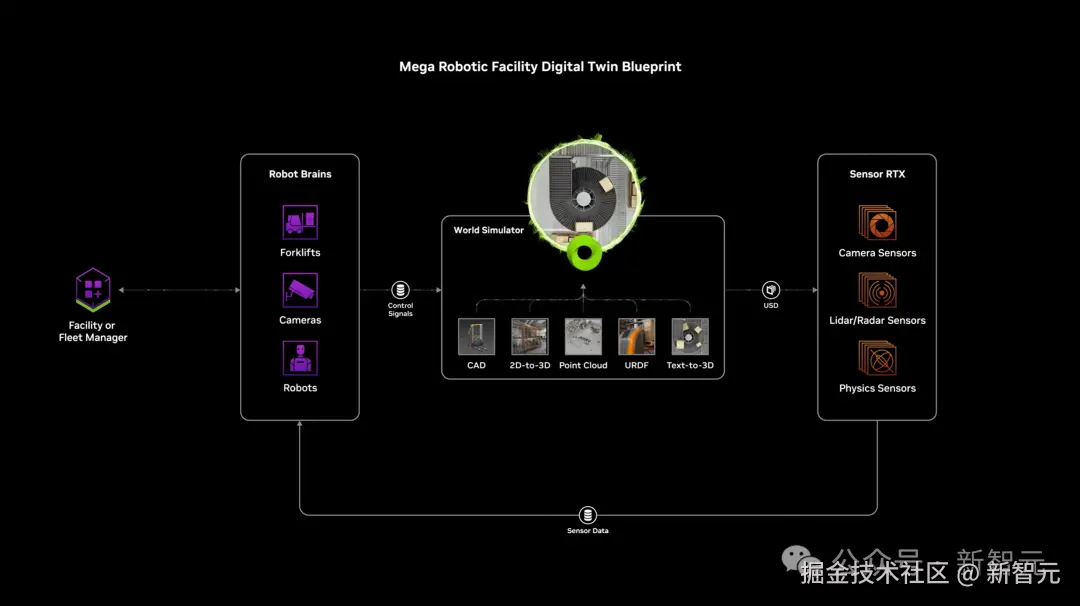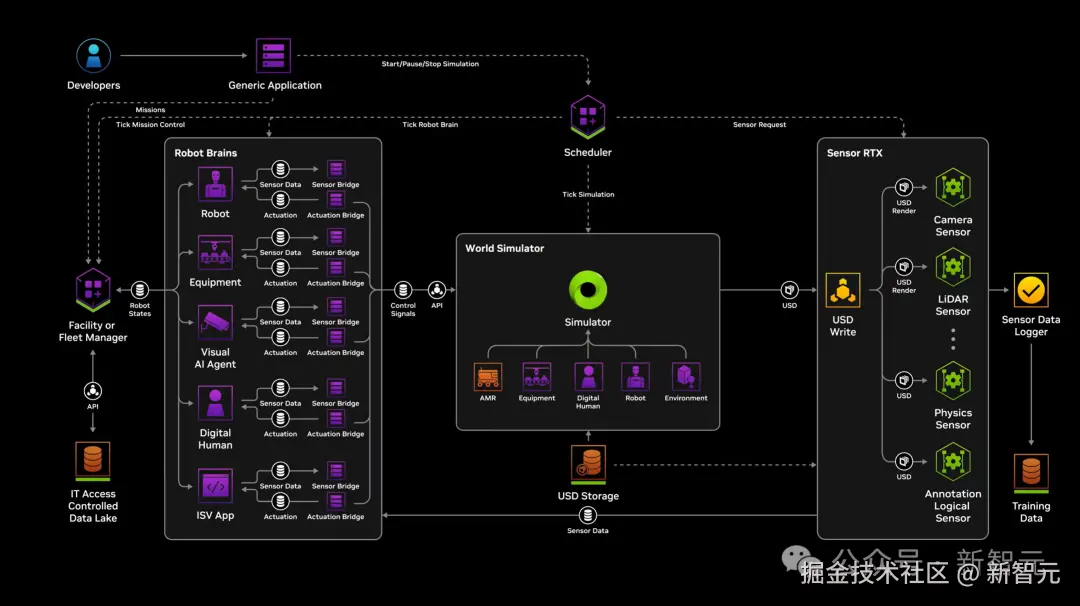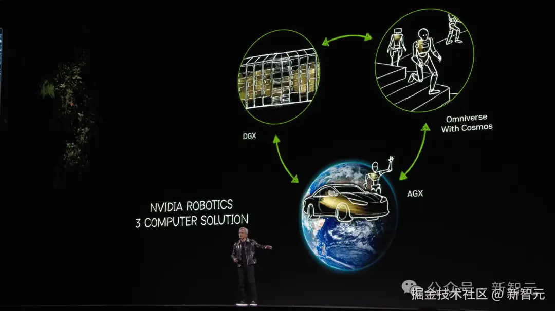 老黄还提到了三台计算机——一台 DGX 用来训练 AI,另一台 AGX 用来部署 AI,最后一台便是 Omniverse+Cosmos。
