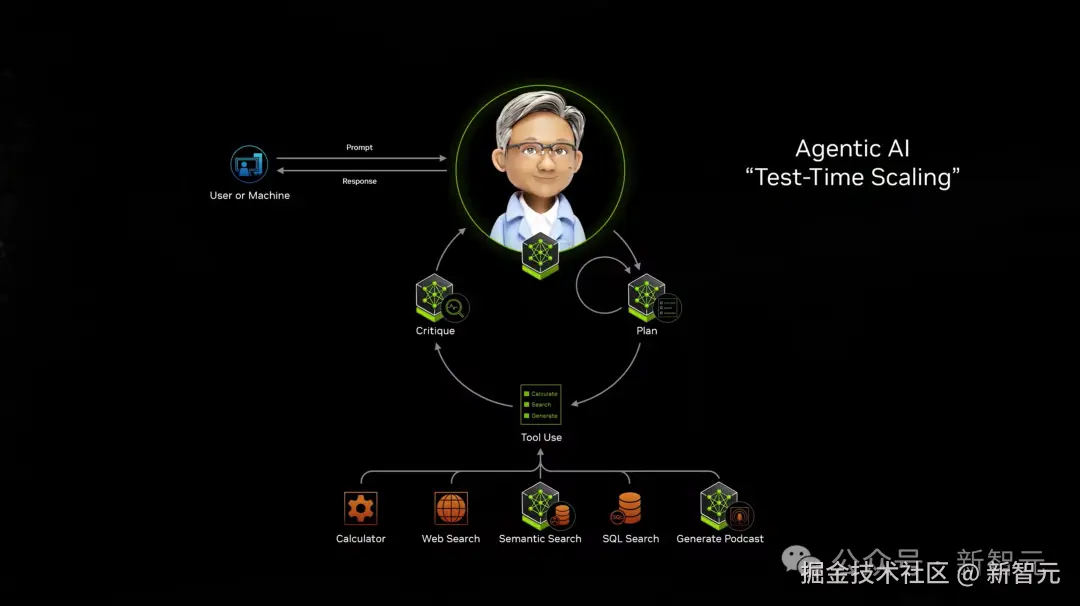 接下来,他又提到了智能体 AI,是测试时 scaling 完美的应用示例。