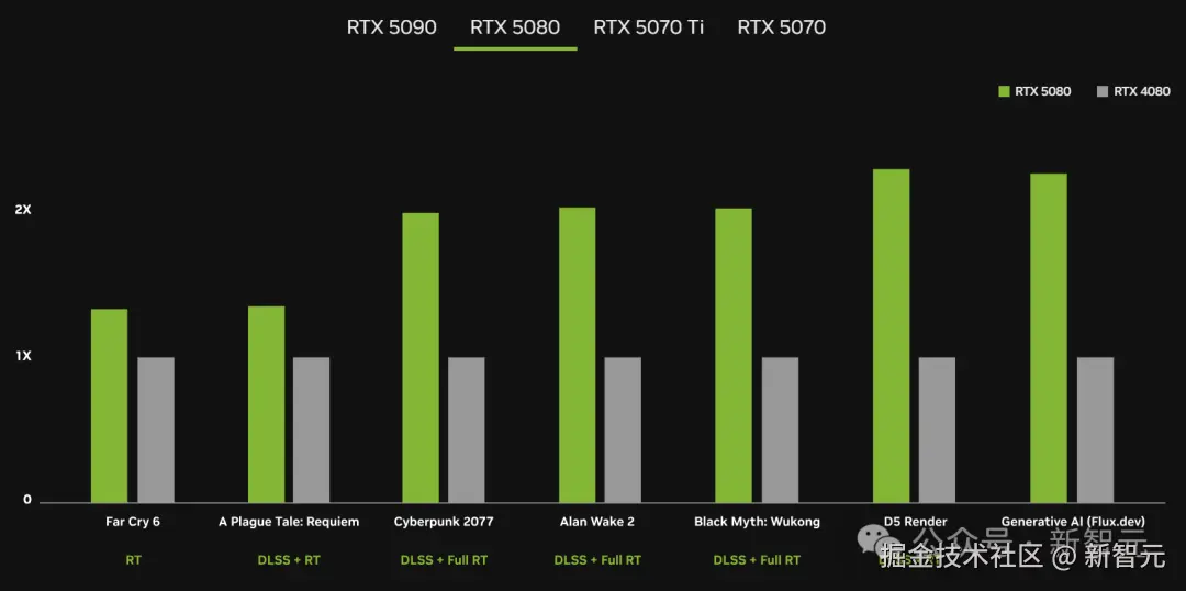 RTX 5080 比 RTX 4080 快一倍,配备 16GB 的 GDDR7 显存,内存带宽为 960GB / 秒,CUDA 核心数量为 10752 个。