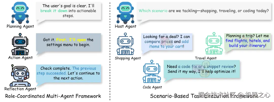 基于场景的任务执行框架(Scenario-Based Task Execution Framework):如 MobileExperts 根据特定任务场景动态分配任务给专家智能体,每个智能体可以具有针对特定场景(如购物、编码、导航)的能力,提高任务成功率和效率。