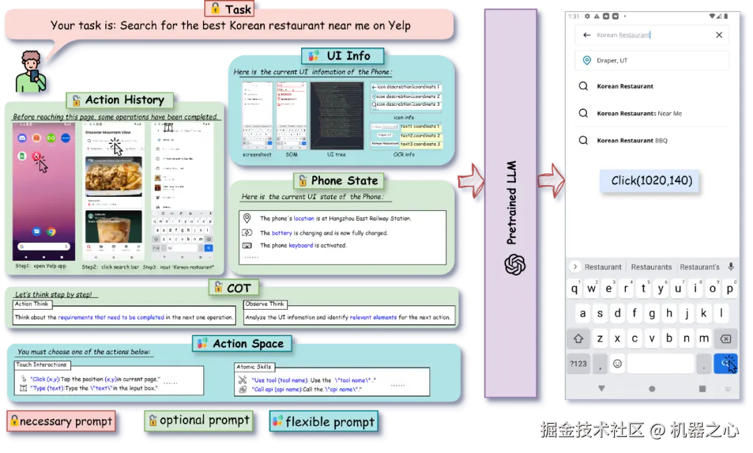 图 5 大模型驱动的手机 GUI 智能体基础框架