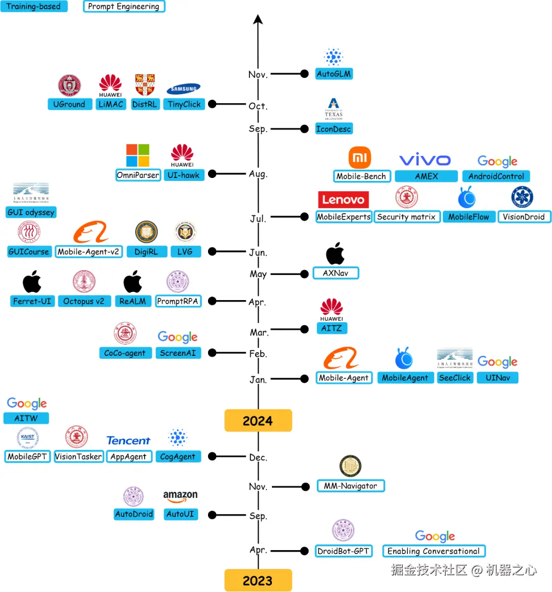 图 4 大模型驱动的手机 GUI 智能体发展里程碑