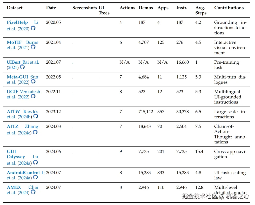 早期数据集:如 PixelHelp 将自然语言指令映射到 UI 动作,UIBert 通过预训练提升 UI 理解,Meta - GUI 收集对话与 GUI 操作痕迹,UGIF 解决多语言 UI 指令跟随问题,MoTIF 引入任务可行性和不确定性。