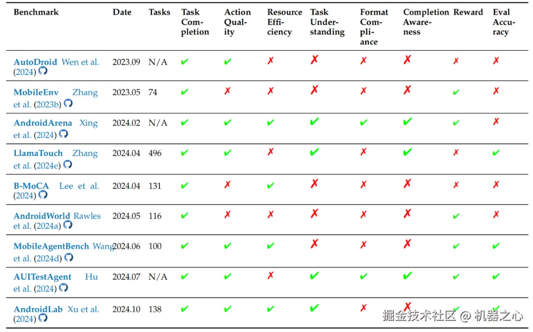 评估方法(Evaluation Pipelines):MobileEnv 提供通用训练和评估平台,AndroidArena 评估 LLM 智能体在复杂 Android 环境中的性能,LlamaTouch 实现移动 UI 任务的设备端执行和评估,B - MoCA 评估不同配置下的移动设备控制智能体,AndroidWorld 提供动态可参数化任务环境,MobileAgentBench 为移动 LLM 智能体提供高效基准,AUITestAgent 实现自动 GUI 测试,AndroidLab 提供系统框架和基准。