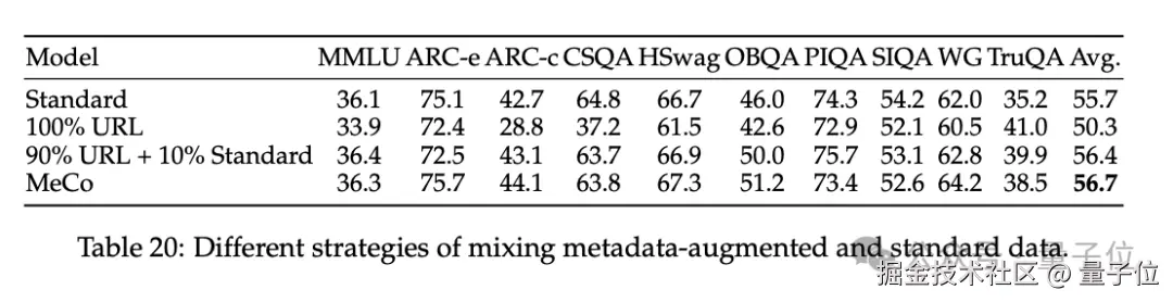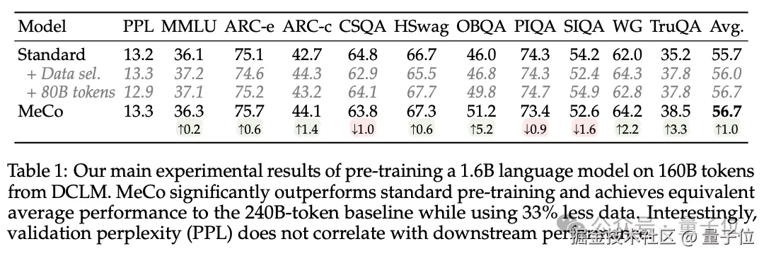 结果显示,MeCo 的表现明显优于标准预训练,其平均性能与 240B 标记的基线相当,而使用的数据却减少了 33%。