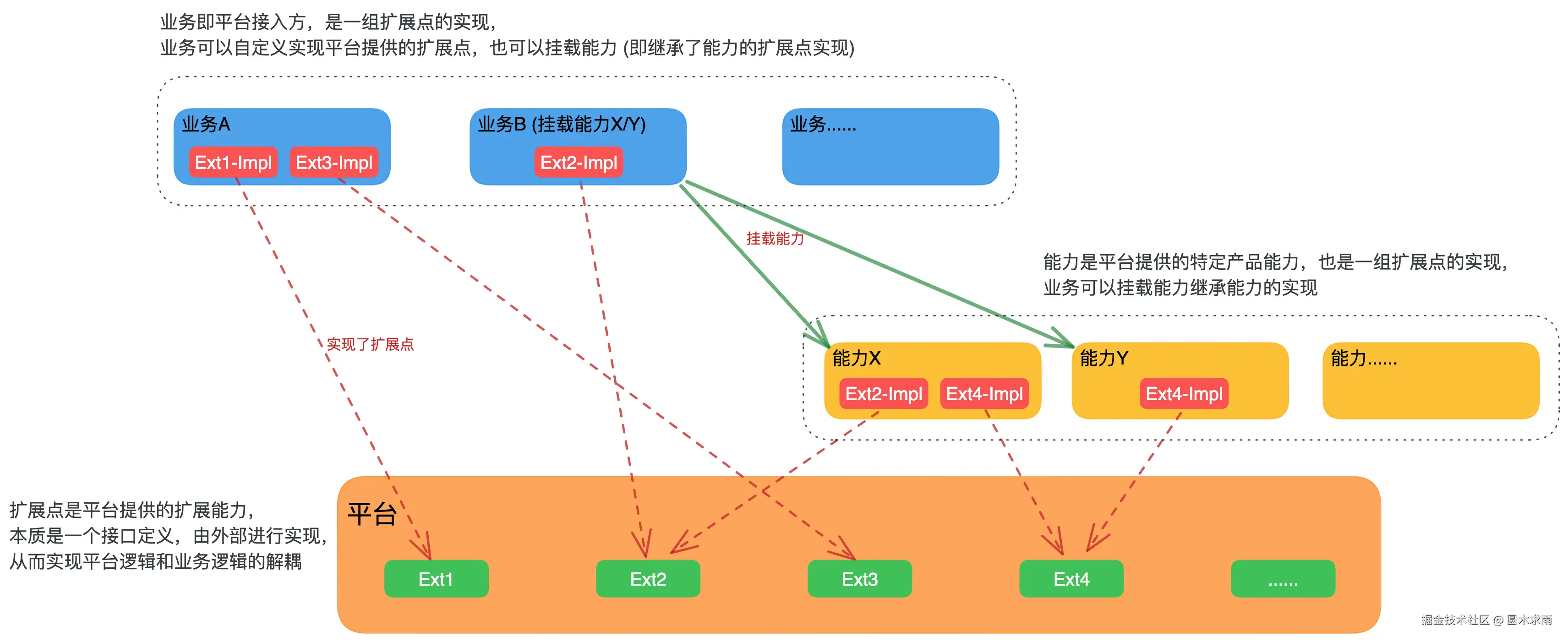 业务:业务即系统接入方,可以通过挂载能力来继承能力的扩展点实现,也可以对扩展点进行自定义实现。从系统角度看,业务也是一组扩展点的实现。