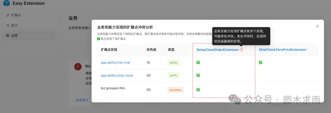 由于业务可以挂载能力(即继承了能力的扩展点实现),因此扩展点就可能匹配到多个实现,框架通过有指定优先级方式进行冲突解决。管理后台提供了可能存在的扩展点冲突检测能力,便于接入阶段进行冲突解决,避免扩展点的错误调用。
