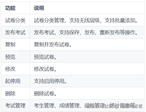管理端功能丰富,包括发布考试、阅卷、考试管理、答题竞赛、问卷调查等。