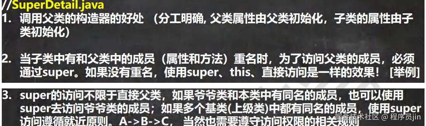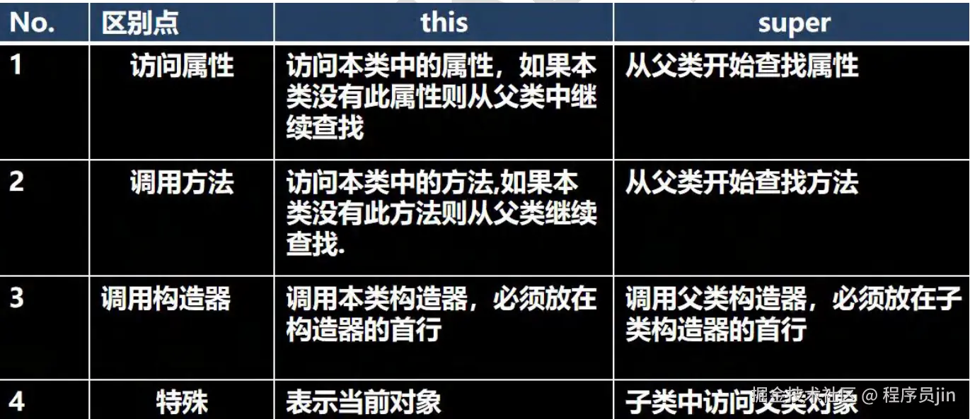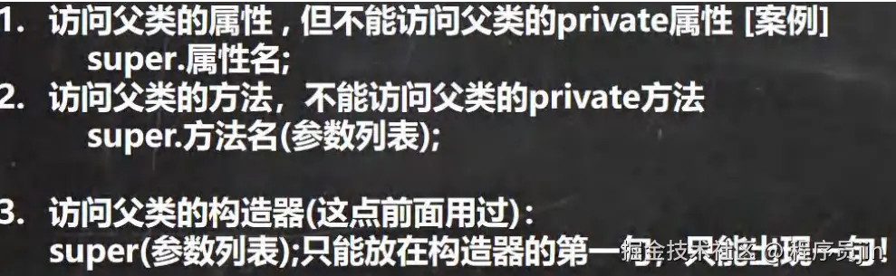 super 代表父类的引用,用于访问父类的属性、方法、构造器.