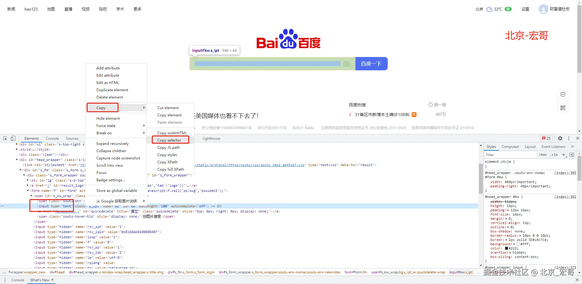(1)打开Chrome浏览器,输入百度网址访问百度首页,F12打开开发者工具,然后Ctrl+F调出输入框,在输入框中输入绝对路径的css表达式(html>body>div>div>div>div>div>form>span>input),回车。查找输入框并输入“北京宏哥”,如下图所示: