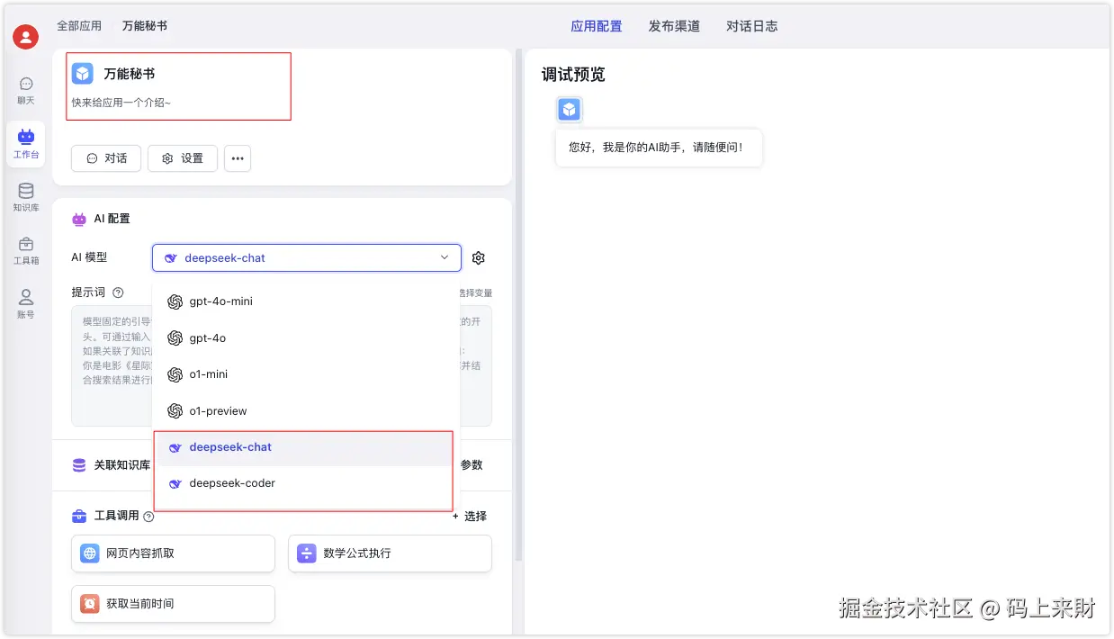 然后根据提示填入模型助手应用的名字、描述,模型选择我们的DeepSeek相关的模型,名字会和config.json里的配置信息是一致的(下拉选项即配置文件中的信息);其他的如:开场白、工具调用都可以适当添加