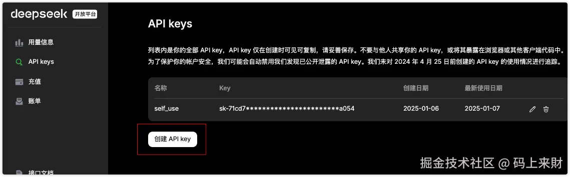 DeepSeek目前是给了500万token的免费使用(具体参考官网),免费使用有时效性大概1个月,但也足够我们玩了。后面如果你还想要使用的话,就需要充值了