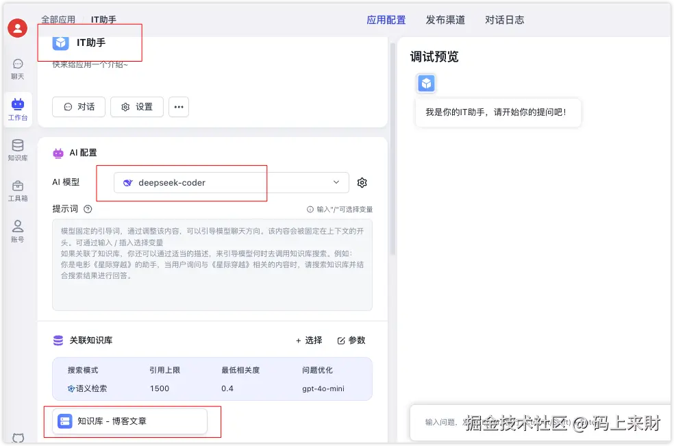 有了知识库后需要将知识库关联到某个模型助手中,这里我们重新创建一个IT助手模型应用,然后关联下刚刚创建的知识库博客知识库