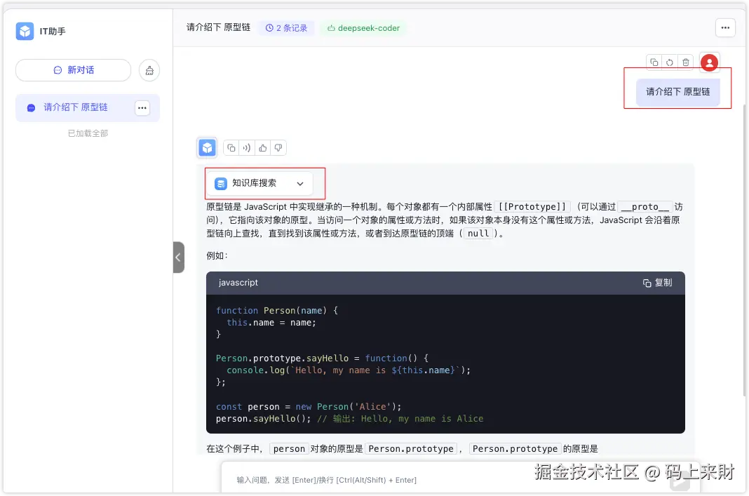 现在打开IT助手对话框,这里我输入请介绍下 原型链,然后助手就参考了下知识库的内容,并生成最后的结果